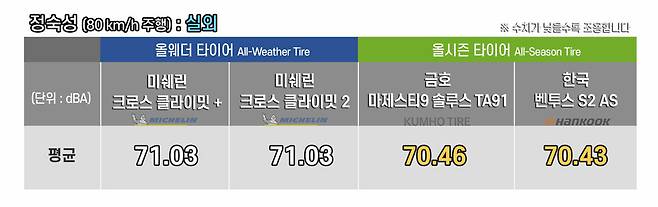 이번에는 경도를 보자. 타이어의 패턴별 단단함을 확인하는 것인데, 평가 항목은 아니다. 값이 높을수록 단단한 패턴을 가진 것이며 낮아질수록 부드럽다고 보면 된다. 측정 결과 올웨더 제품들이 부드럽고, 올시즌이 조금 단단한 성향을 보였다. 항상 동일한 것은 아니지만 타이어가 부드러웠을 때 소음은 불리해도 성능서 이점을 보이는 경우가 많았다.