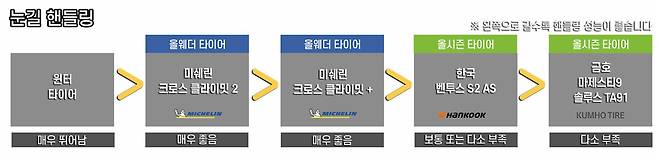 2021년 가을 시작된 비교가 2022년 봄까지 밀리면서 겨울을 지나게 됐다. 덕분에 겨울철 눈길 시험을 더할 수 있었다. 당초 4개 타이어만 비교할 계획이었는데, 마침 우리 팀이 보유한 같은 규격의 윈터 타이어가 있어 이를 비교 대조군으로 넣었다.