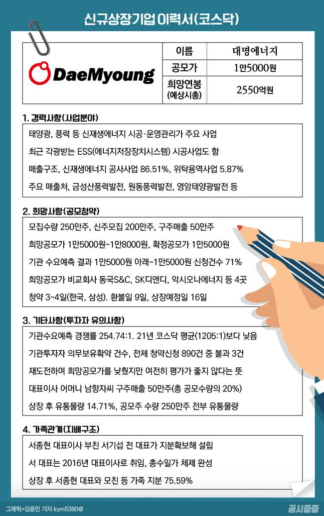 -구주매출을 통해 차익실현을 하는 사람은 서종현 대명에너지 대표이사의 어머니 남향자씨. 남향자씨는 50만주를 구주매출로 내놓음. 첫 증권신고서 제출 당시 남향자씨는 보유지분(75만주)의 91%인 68만주를 구주매출로 내놓았다가 비중을 줄임. 서 대표이사도 105만주를 구주매출로 내놓았으나 취소.