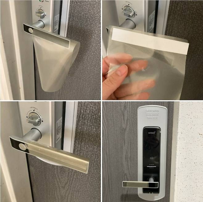 일단 현관 손잡이 안과 밖 모두 붙여줬는데요