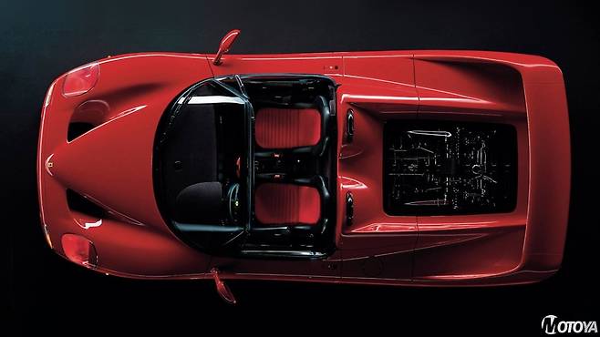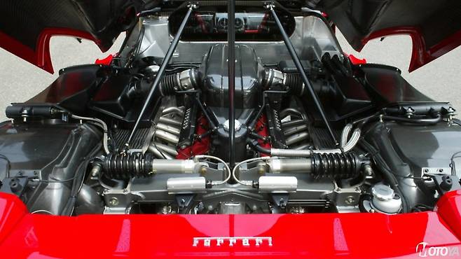 페라리 F50은 심장부터 달랐다. 페라리의 F1 경주차에 사용된 3.5리터 V12엔진을 기반으로 한 엔진을 적용한 것이다. 물론 수명 확보를 위해 배기량은 4.7리터로 올리는 한 편, 최고 회전수를 8,500rpm으로 줄이는 등의 개량을 거친 이 엔진은 520마력에 달하는 최고출력을 자랑했다. 게다가 과급 엔진도 아닌, 자연흡기 엔진으로 배기량 1리터 당 100마력을 훌쩍 상회하는 초고출력 엔진을 만들어 낸 것이다. 그러나 최고속도는 325km/h에 그쳐, 맥라렌 F1과의 속도경쟁에서는 밀리고 말았다. 그렇지만, F50은 카본 모노코크 차체구조 등, 현대적인 하이퍼카의 방법론을 이루는 신기술들을 제시한 기념비적인 모델이다.