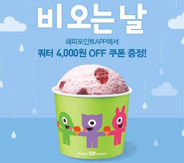 눈이나 비가 오는 날에는 배스킨라빈스 할인쿠폰을 받을 수 있다. 해피포인트 앱의 위치 정보에 기반해, 해당 지역의 날씨가 눈이나 비로 표기되면 할인쿠폰 발행이 활성화된다. 제품 구매 시점에 눈이나 비가 오지 않아도, 앱의 데이터를 기반으로 발행된다. 레이니데이 쿠폰은 4가지 맛을 선택할 수 있는 쿼터 제품을 만 원에 구매할 수 있는 쿠폰이며, 다른 제품에는 할인이 적용되지 않는다.