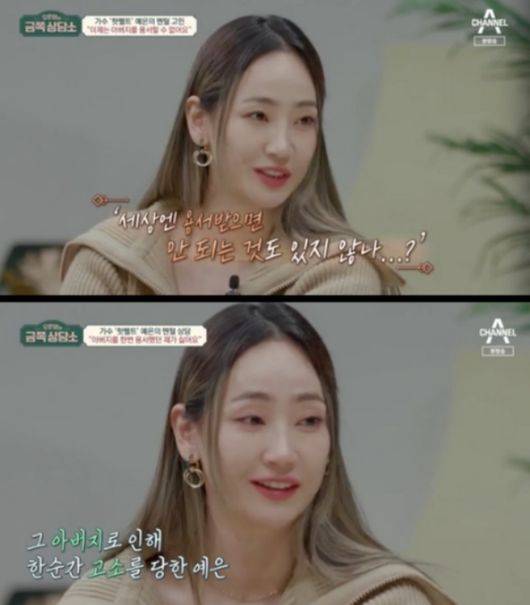 오랜만에 방송에 나선 예은은 이날 아버지를 용서할 수 없는 상황을 털어놨다. 예은은 “아버지가 사기죄로 수감생활 중이다. 벌써 5년 정도 됐다. 이제는 제 인생에서 아버지의 존재를 지웠는데 주변 사람들이 ‘용서하라’는 말을 많이 한다. 저는 세상에 용서받으면 안 되는 것도 있다고 생각한다”라고 말했다.