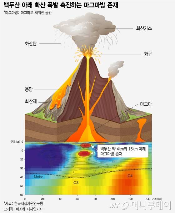 21일 과학계에 따르면 매 세기(100년)마다 분화했던 백두산은 1925년을 기점으로 화산 활동을 멈췄다. 하지만 화산 분출을 촉진하는 마그마방(마그마가 존재하는 공간)이 백두산 천지 하부 약 4㎞와 15㎞에 존재한다는 사실이 연구를 통해 밝혀지면서 폭발이 임박했다는 분석이 나온다.