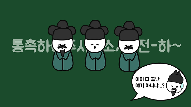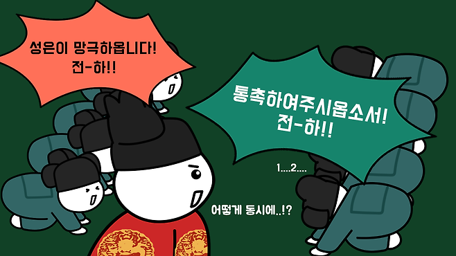 임금과 신하들이 한 자리에 모여서 정사(政事, 나라를 다스리는 일)를 처리하는 장면에서 주로 볼 수 있는데, 임금의 말에 따라서 신하들이 한 목소리로 "통촉하여 주시옵소서 전하" 또는 "성은이 망극하옵니다 전하"라고 합창합니다. 어떻게 신하들의 입에서 나오는 말이 토씨 하나까지 똑같은 것이고, 정확한 타이밍에 합창할 수 있는 걸까요?
