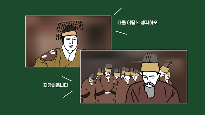 사극의 극적 긴장감을 높이고, 대화체 형식을 유지하기 위해 각색했다는 것을 가장 합리적인 이유로 생각해볼 수 있습니다. 앞서 알아본 시스템대로 정사를 처리하고, 왕이 "그렇게 한다"고 결정했을 때 논의가 그대로 끝나버리면 당연히 재미가 없었을 겁니다.