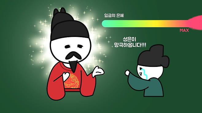 다음으로 성은(聖恩)은 임금의 은혜라는 뜻을 지녔습니다. 보통 임금의 처분이나 감정을 칭하는 높임말로 쓰이고, 망극은 한도가 없다는 뜻으로 쓰입니다. 그러니까 "성은이 망극하옵니다"는 대상의 크기나 막대함을 과장하는 표현으로 극진히 예의를 갖춰 감사함을 표하는 말입니다.