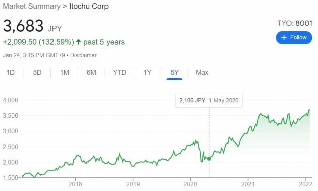 24일 동경증권거래소에서 이토추상사는 전거래일 대비 0.74% 오른 3675엔에 장을 마쳤다. 전날에 이어 사상 최고가를 다시 썼다. 이토추상사는 2020년 17% 오르고, 2021년에도 19% 오른데 이어 올해도 5% 상승을 이어가고 있다. 유동성 장세서 폭발적으로 상승하진 않았지만 변동성이 큰 올해에도 꿋꿋이 오르며 건재함을 보이고 있다.