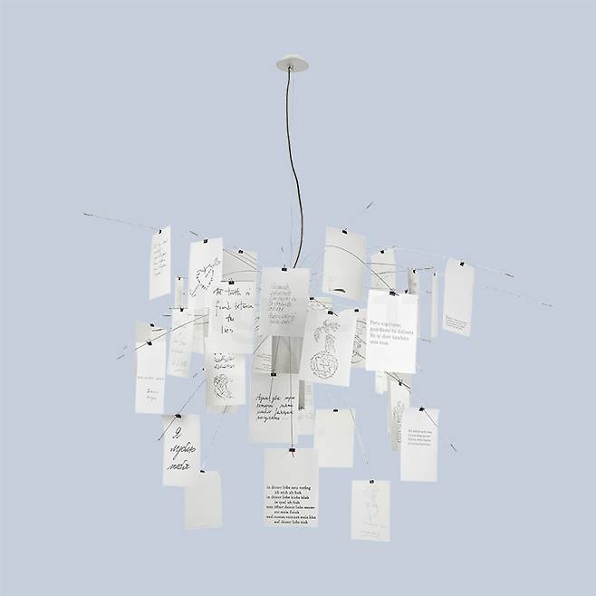 메모지와 철사, 문구용 집게만으로 디자인한 샹들리에 조명이다. 자세히 보면 메모지에 글씨가 적혀져 있으며 공간에 걸어두었을 때 확실한 존재감을 선사한다. 메모지를 투과해 빛이 은은하게 퍼져나가는 것이 매력적인 아이템이다.