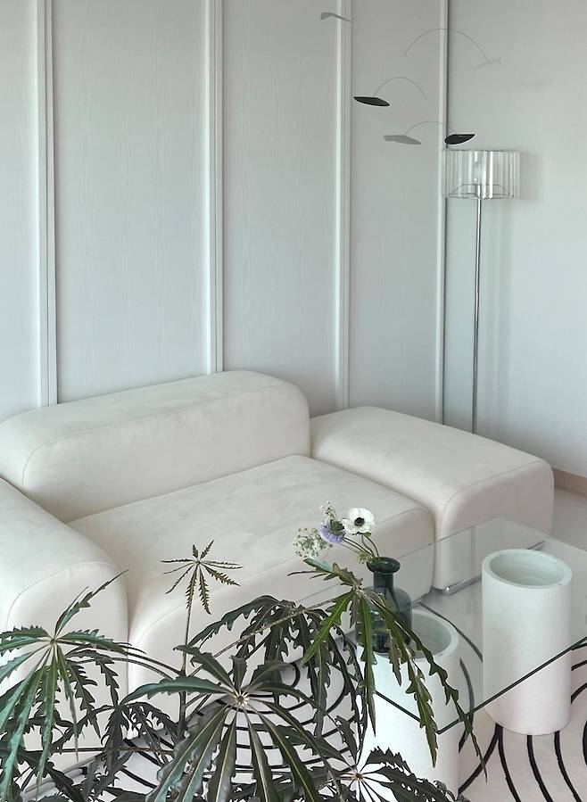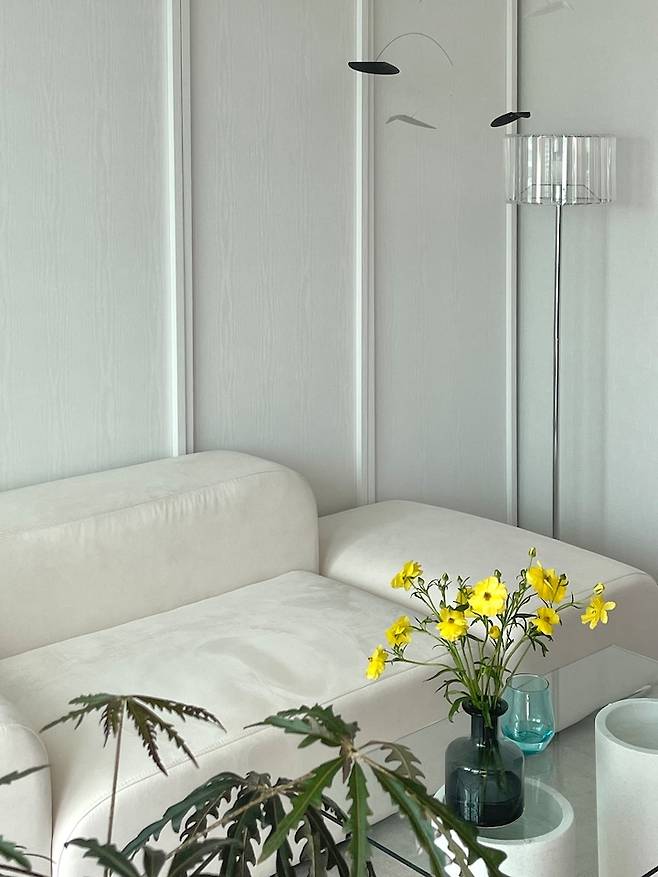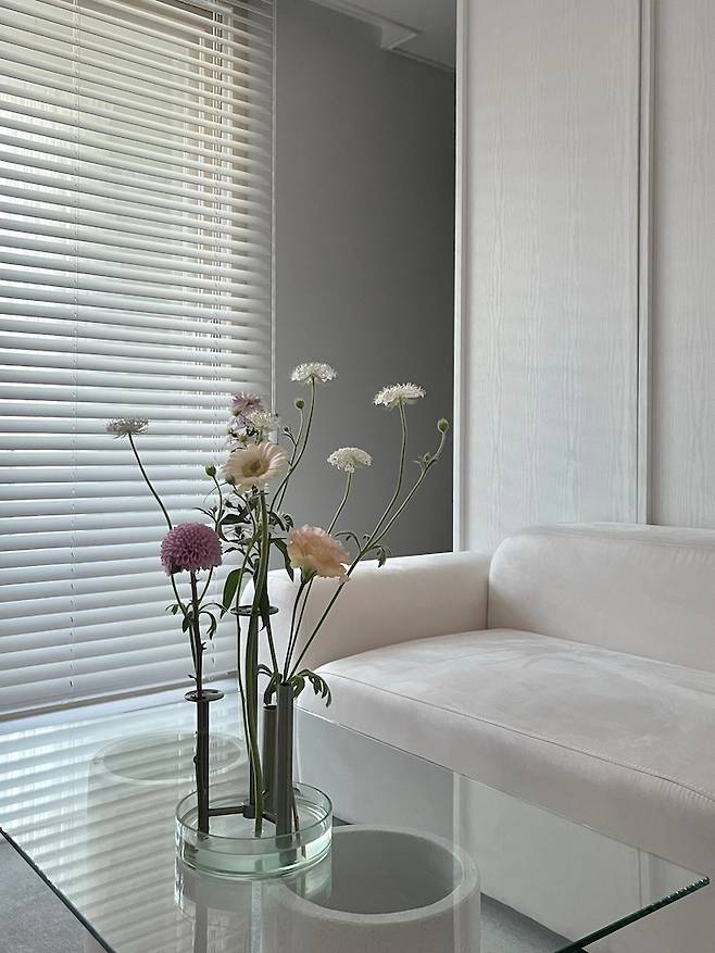 화이트 톤이라 거실 분위기가 밋밋할 수 있어 꽃으로 포인트를 주고 있어요. 꽃 한 송이가 분위기를 확확 바꾸더라고요!