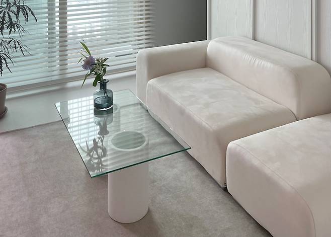 소파 앞의 소파 테이블은 '펌리빙'의 미네랄 커피 테이블을 오마주해서 만든 테이블이에요. 펌리빙의 테이블은 너무 비싸고, 비슷한 느낌의 테이블을 찾기가 힘들어 고민하던 와중 화분을 이용해 소파 테이블을 만드신 분의 아이디어를 빌려 저도 비슷하게 만들어보았습니다. 제가 원하던 느낌이라 정말 만족스러워요! 시멘트 화분과 유리를 따로 구매했고, 화분과 유리 사이에는 실리콘을 넣어 밀리지 않도록 해주었습니다.