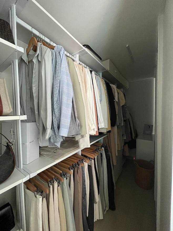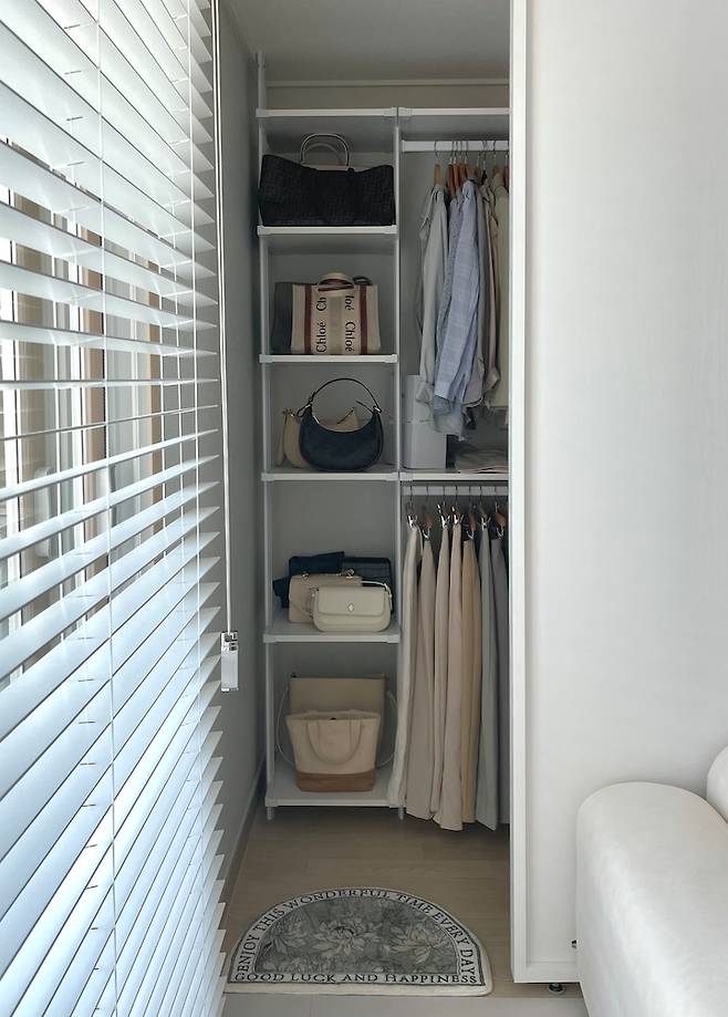 사실 거실에는 숨겨진 공간이 하나 더 있답니다. ㅎㅎ 바로 저의 드레스룸인데요, 작은 방을 침실로 써서 옷을 보관할 공간이 없었기에, 거실 일부를 드레스룸으로 만들었습니다.