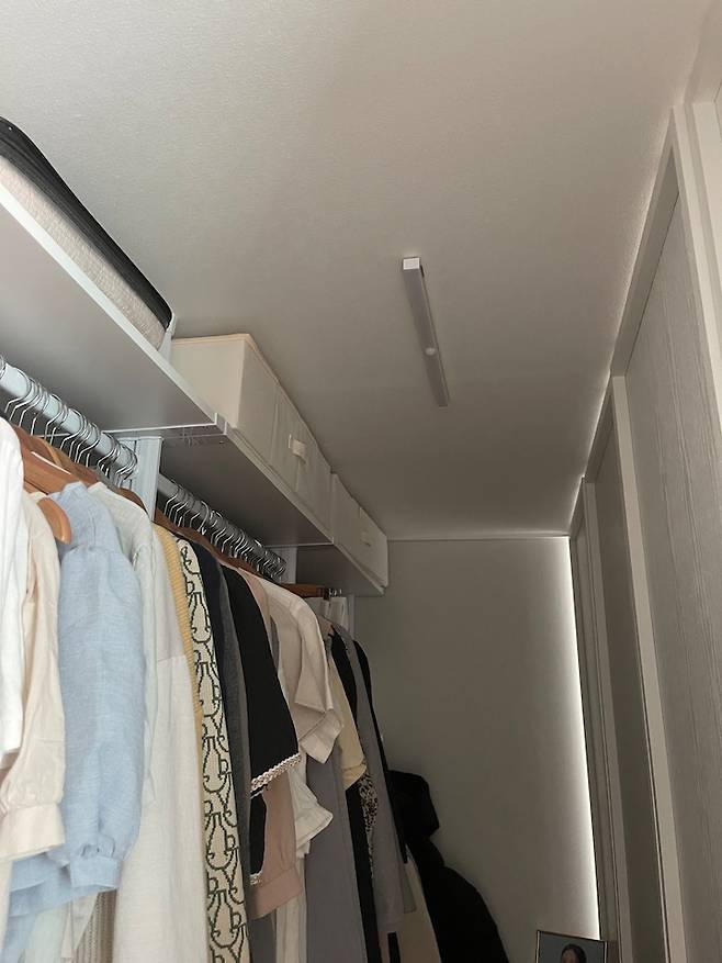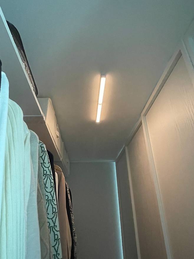 드레스 룸에는 조명이 따로 없기 때문에 센서등을 부착해 달아 주었어요. 충전식이라 선을 연결할 필요도 없고 3-4주에 한번 정도 떼어내 충전시켜주면 되어서 정말 편리하게 사용하고 있어요! 자석 부착식이라 떼었다 붙였다 하기에도 좋아요. 이 제품도 정말 추천드려요.