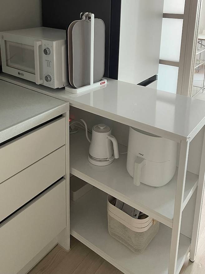 주방 또한 전자레인지와 에어프라이어 등 각종 조리 기기들을 어디 두어야 할지 고민이 많았어요. 임대 주택의 주방은 조리대와 수납이 모두 부족한 편이라 보통 렌지대나 카페장을 반대쪽에 넣고 상하부장 옆 공간에 냉장고를 넣어서 배치하더라고요. 하지만 저는 꼭 식탁도 넣고 싶었어요. 냉장고, 렌지대, 식탁 모두 포기할 수 없었는데 공간이 나오질 않아 가장 오랫동안 고민한 공간이었습니다.