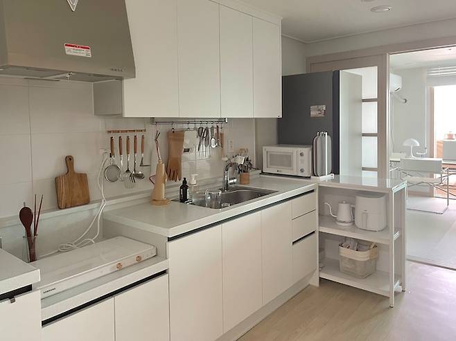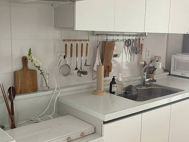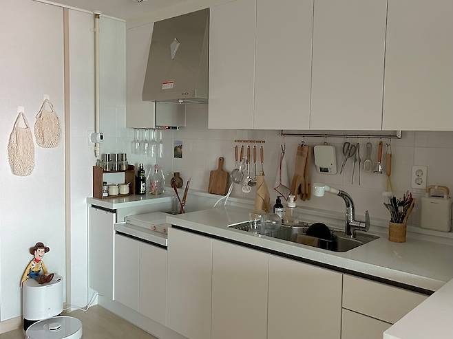 저는 요리하는 것도 좋아해서 예쁜 주방에 대한 욕심이 있었어요. 하고 싶은 주방 인테리어는 많았지만 그렇다고 상부장을 모두 떼어버릴 수는 없는 노릇이었어요. 공사는 할 수 없으니 가능한 범위 내에서 소품들을 이용해 제가 원하는 따뜻한 주방의 느낌을 최대한 살려보려고 노력했습니다.