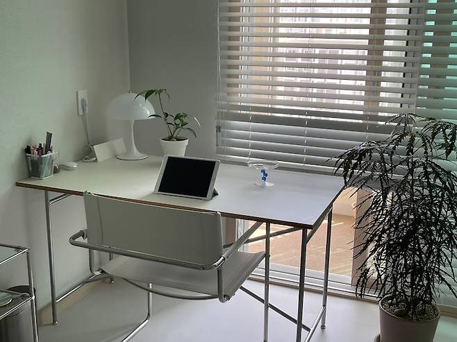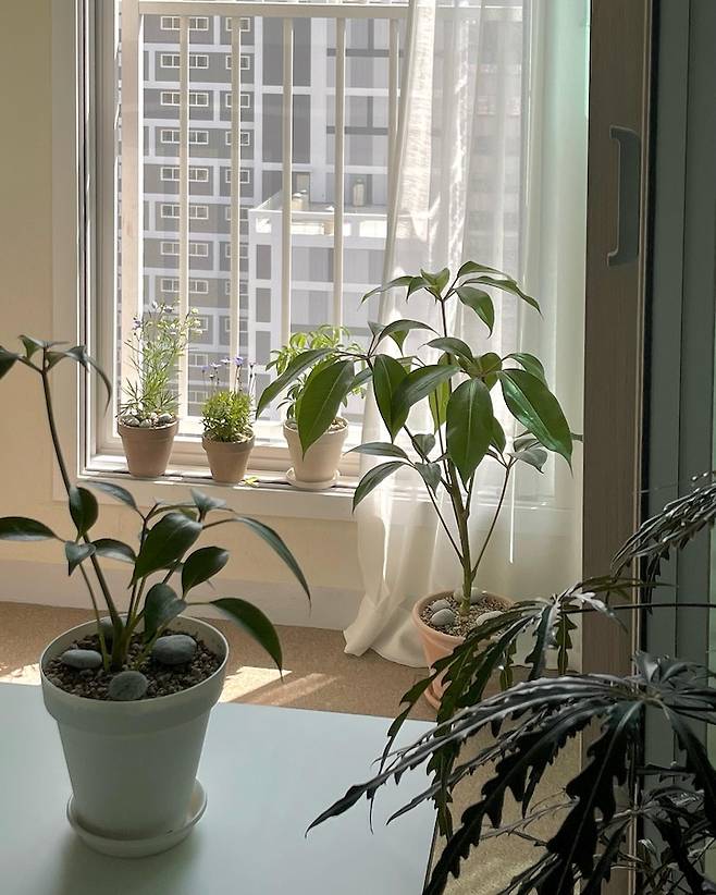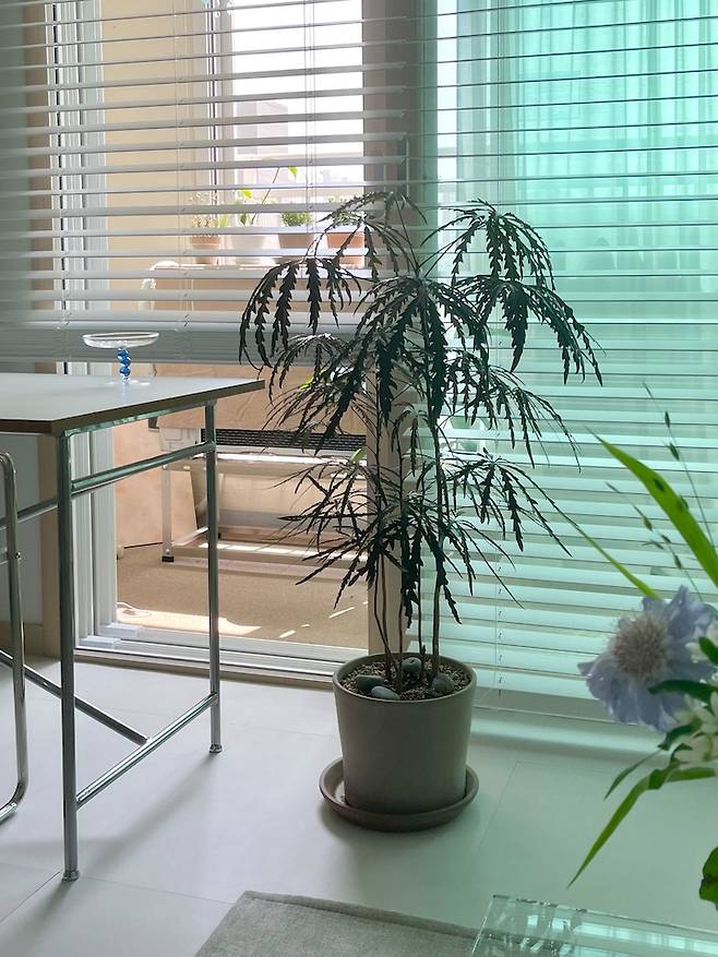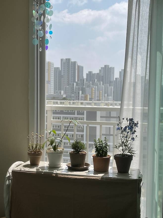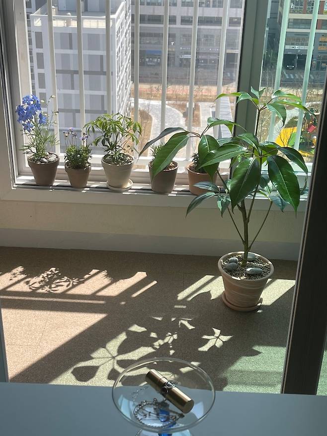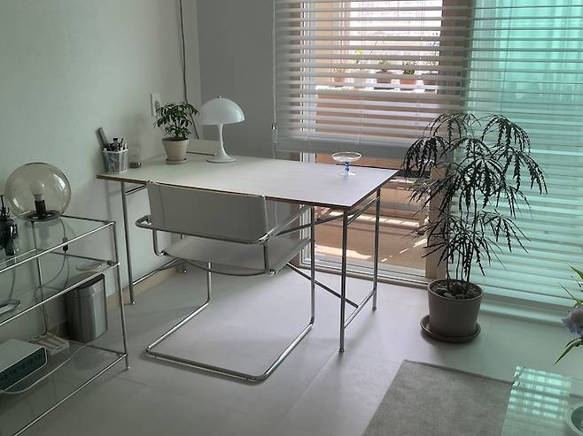저는 햇살과 바람을 너무 좋아해서 일부러 테이블을 창문 바로 앞에 두었는데요. 테이블에 앉으면 저의 베란다에서 자라고 있는 식물들이 보인답니다. 이 베란다도 마지막에 소개해드릴게요!