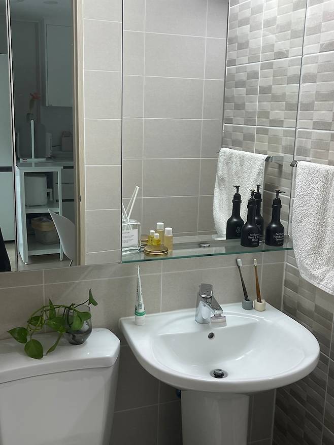 세면대에는 화장실 분위기와 어울리는 핸드 워시를 두고 옆에는 귀여운 스킨답서스도 하나 올려주었어요. 아 그리고 저는 변기에 온열 시트를 설치했는데 비데는 사용하지 않지만 따뜻한 시트를 원하시는 분은 정말 추천합니다! 특히 겨울에 진가가 드러날 것 같아요! ㅋㅋ