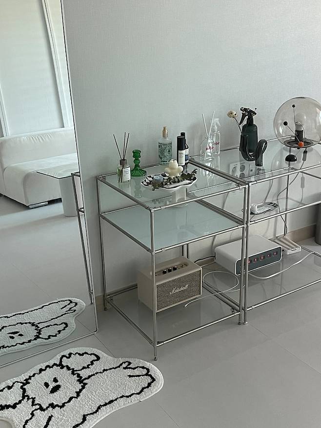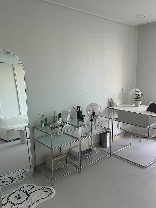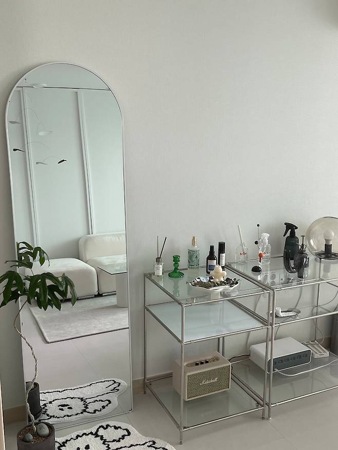 맞은편에는 tv대신 모듈 선반과 전신 거울을 놓았어요. tv 시청은 잘 하지 않는 편이어서 모듈 선반에 블루투스 스피커와 각종 소품들을 올려놓았습니다.