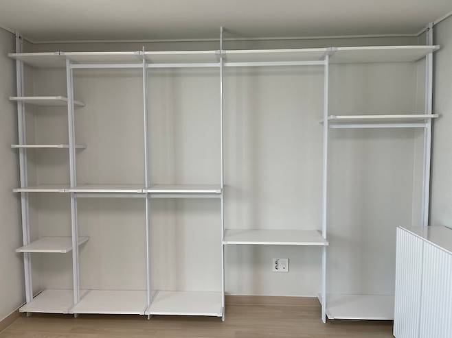 저는 옷도 많은 편이라 옷장 공간이 크게 필요했기 때문에 벽면 하나를 통째로 시스템 행거로 채웠어요. 공간 활용을 최대로 높이기 위해서 1자로 설치했습니다. 위의 틈새 부분까지 꽉꽉 채워 수납 중이에요.ㅋㅋ