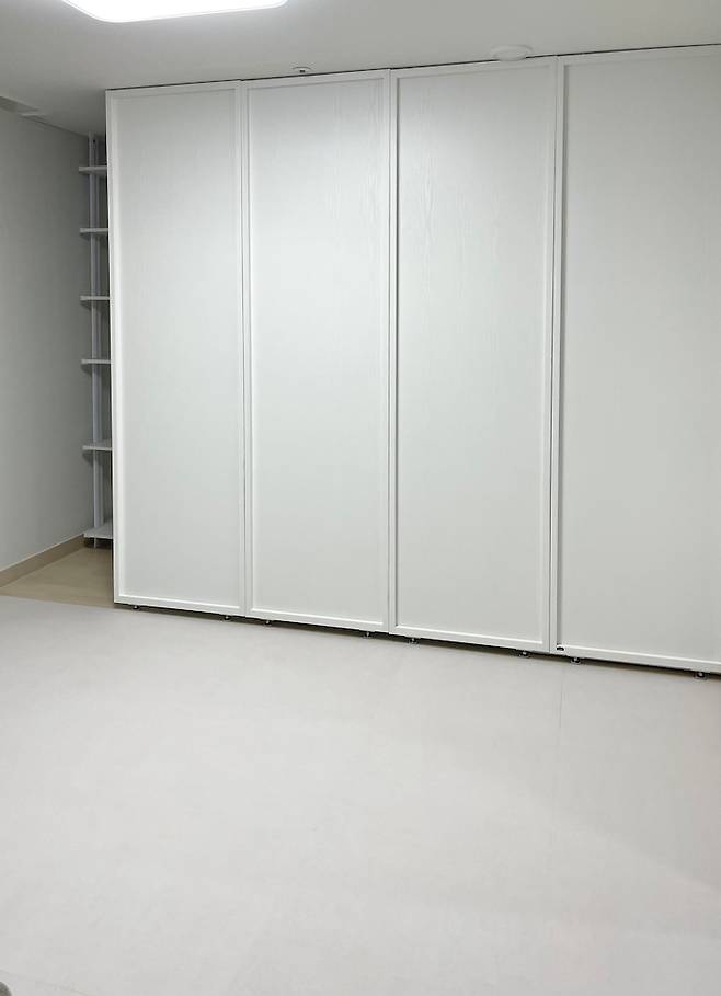 맞은편에는 수납장 하나를 두었는데요. 원래는 ㄱ자로 놓고 싶었어요. 하지만 ㄱ자로 배치하니 가벽 설치 위치가 환풍구와 겹쳐 어쩔 수 없이 마주 보도록 놓았습니다. 수납장을 열기가 정말 어렵지만 꺼낼 일이 거의 없는 물건을 넣어두는 창고의 느낌이어서 아직까지 큰 불편함은 느끼지 않아요.
