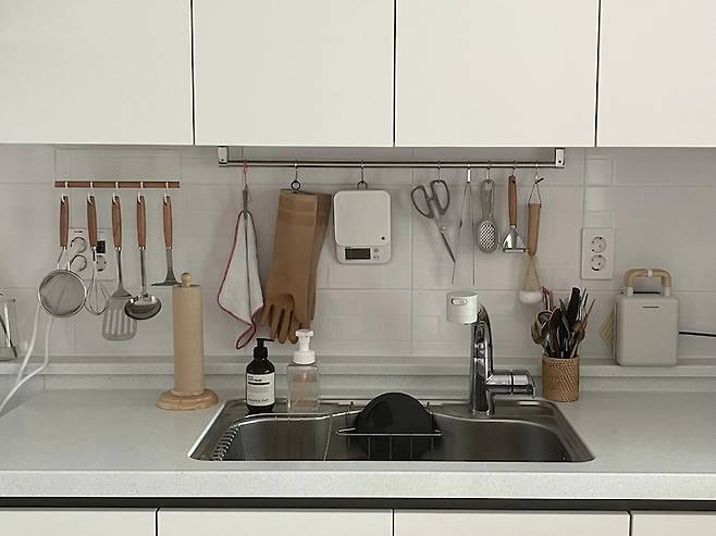 우드톤의 조리 도구들을 걸어두고, 고무장갑과 수세미도 주방 톤에 맞추어 베이지색으로 구매했어요. 도마도 나무도마였다면 좋았겠지만 깨끗하게 관리하기가 어려워서 걸어둘 수 있는 tpu 도마를 구매해서 전자레인지 옆에 두었습니다.