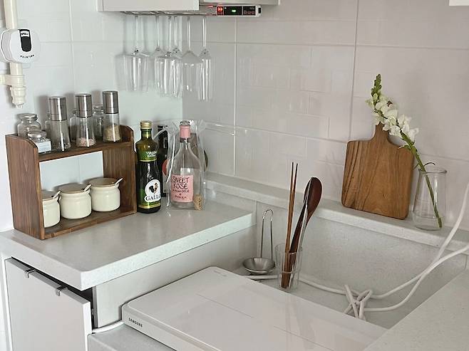 인덕션도 화이트 톤으로 구매했어요. 인덕션 왼쪽의 작은 공간에는 와인랙을 걸어 와인잔을 걸어두고 아래에는 각종 조미료와 오일들을 보관해 두었어요.