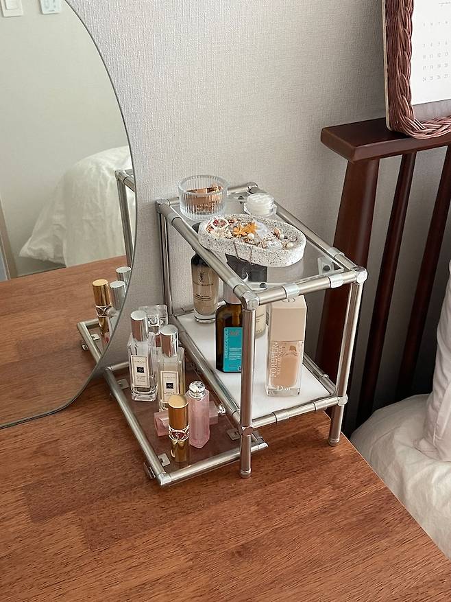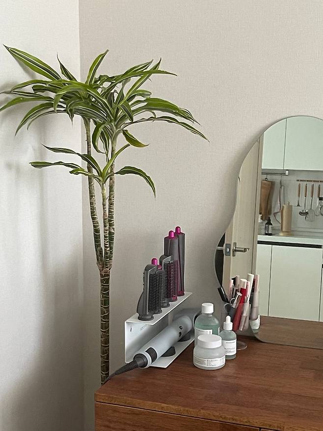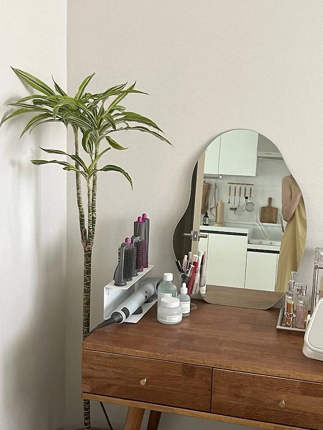 막상 놓고 보니 꽉 막혀있는 수납형 화장대를 샀으면 너무 답답해 보였을 것 같아요! 제가 너무 좋아하는 화장대 공간이랍니다.