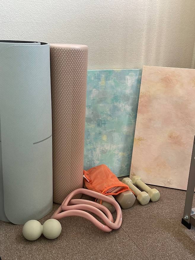 베란다에도 타일 매트를 깔아주었는데요, 자르는 게 정말 힘들었지만 깔아 두니 맨발로 왔다 갔다 할 수 있어서 정말 좋아요. 사실 이 매트를 깐 이유는 운동 때문이에요. 홈짐을 만들고 싶었거든요! 웨이트는 집에서 잘 안 하게 되어서 헬스장을 가지만 간단하게 스트레칭을 할 수 있는 운동 기구들을 벽 한편에 두었습니다. 바닥에는 매트도 깔아 두어서 이 공간에서 햇살을 받으며 스트레칭을 하기도 합니다. 뒤에 제가 그린 그림도 보이네요ㅎㅎ