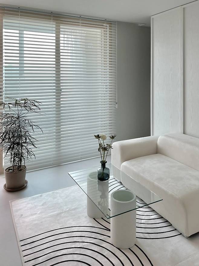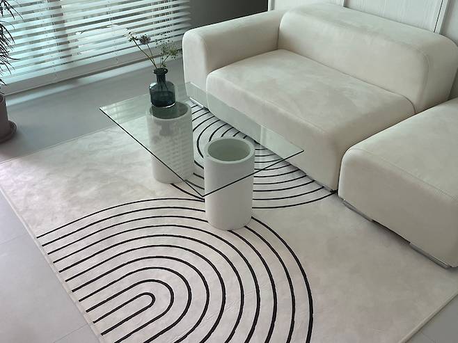 러그는 간편하게 거실 분위기를 바꿀 수 있는 좋은 소재라 기분에 따라 바꾸어가며 사용하고 있어요. 지금까지는 특이한 무늬가 있는 화이트 러그와 질리지 않는 베이지색 러그 두 가지를 놓아보았는데 모두 잘 어울리는 것 같아요.