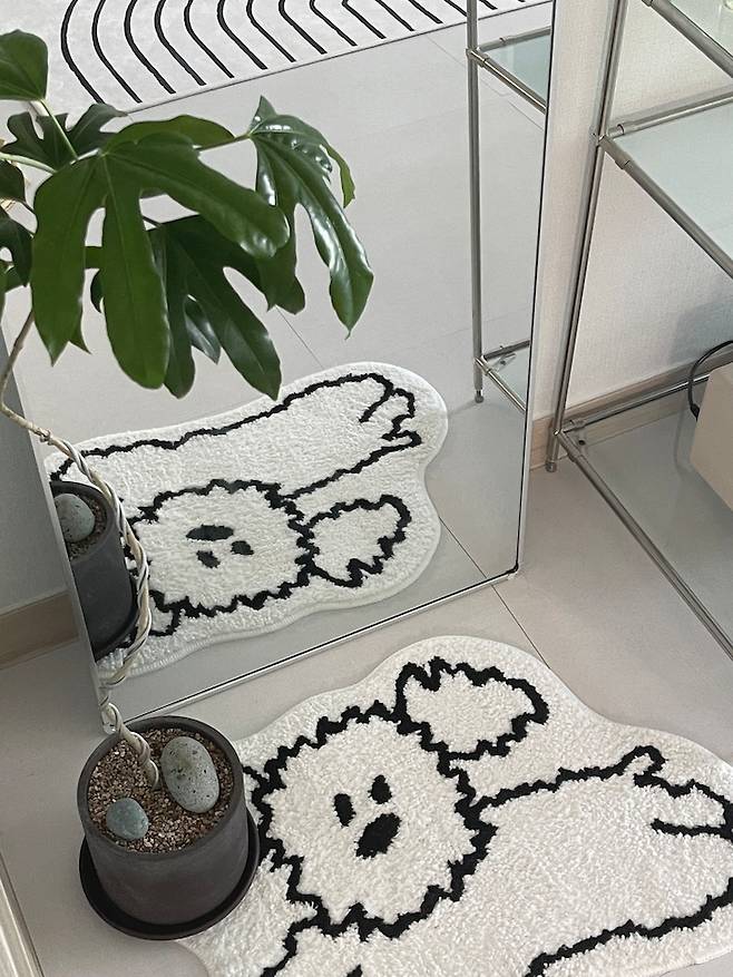 거울은 거실 분위기에 맞춰 철제 프레임이 있는 아치형 거울을 구매했고 앞에는 너무 귀여운 강아지 발매트를 두었어요! 강아지를 정말 좋아하는데 키울 수가 없어 발매트가 대신하고 있습니다ㅠㅠ 그리고 바로 옆에는 요즘 아주 핫한 반려식물인 황칠나무도 자라고 있어요.