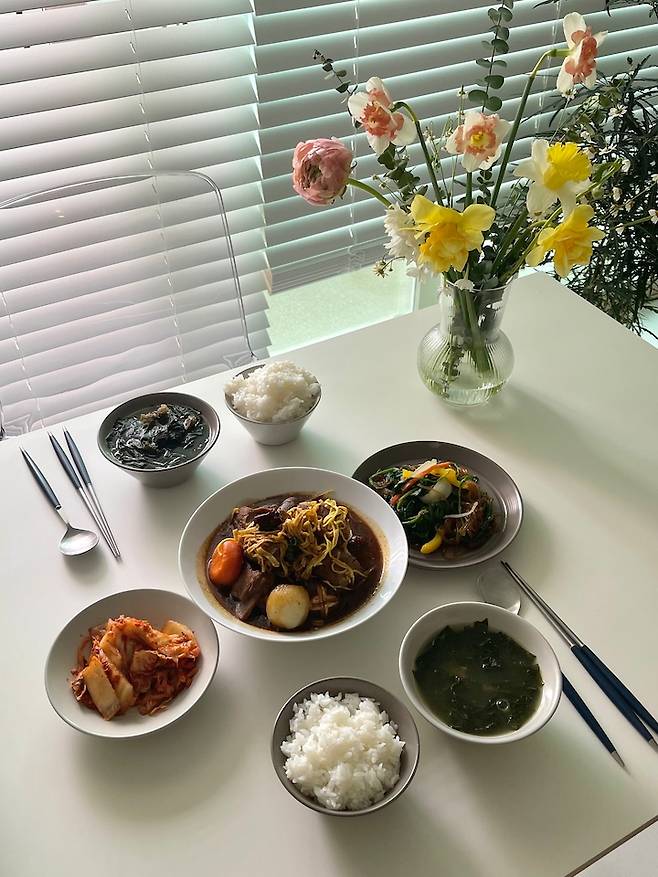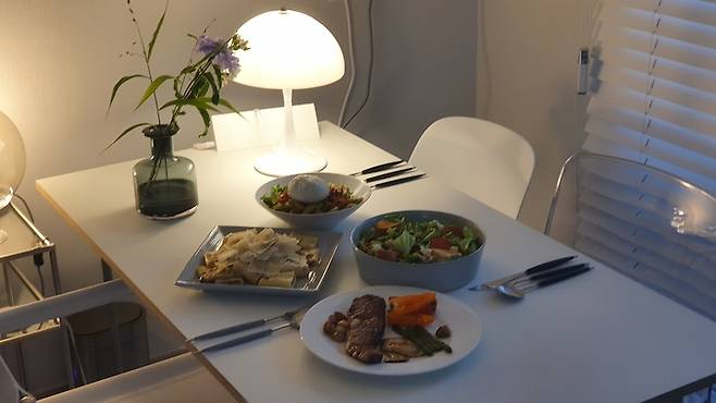 제가 큰 테이블을 가지고 싶었던 가장 큰 이유는 친구들이 놀러 왔을 때 함께 앉아서 식사할만한 공간을 만들고 싶다는 거였어요. 항상 자취방 바닥에 접이식 테이블을 펼쳐두고 배달음식을 시켜먹었는데 이번에는 이 테이블 덕분에 근사한 집들이를 할 수 있었답니다.