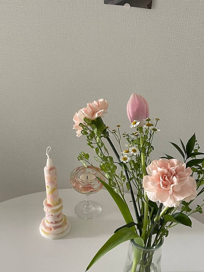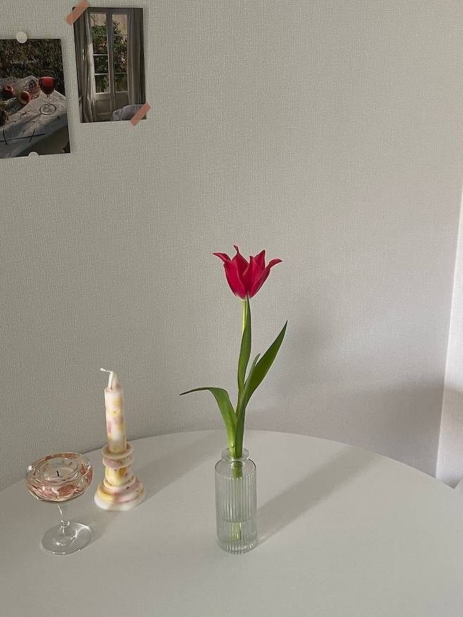 식탁 위에는 제가 직접 만든 캔들과 선물 받은 캔들 홀더, 그리고 항상 꽃 한 송이를 놓아둔답니다.