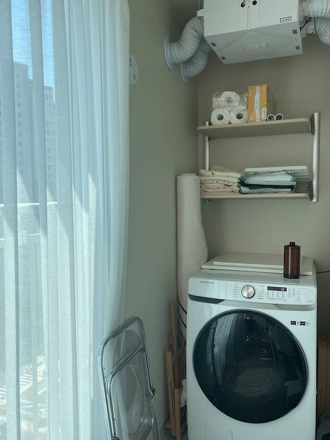 반대편에는 세탁기와 각종 짐들을 보관하고 있어요. 이 공간도 조만간 커튼을 만들어 가려보아야겠어요!