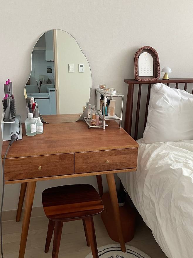 침대 옆 화장대 위에는 가지고 있던 거울을 두고 제가 직접 만든 모듈 거치대도 올려두었어요. 사실 좁은 집이라 수납공간이 부족해 수납이 많이 되는 화장대를 고를까 했지만 이 화장대가 너무 마음에 들어 포기할 수 없었어요ㅠㅠ