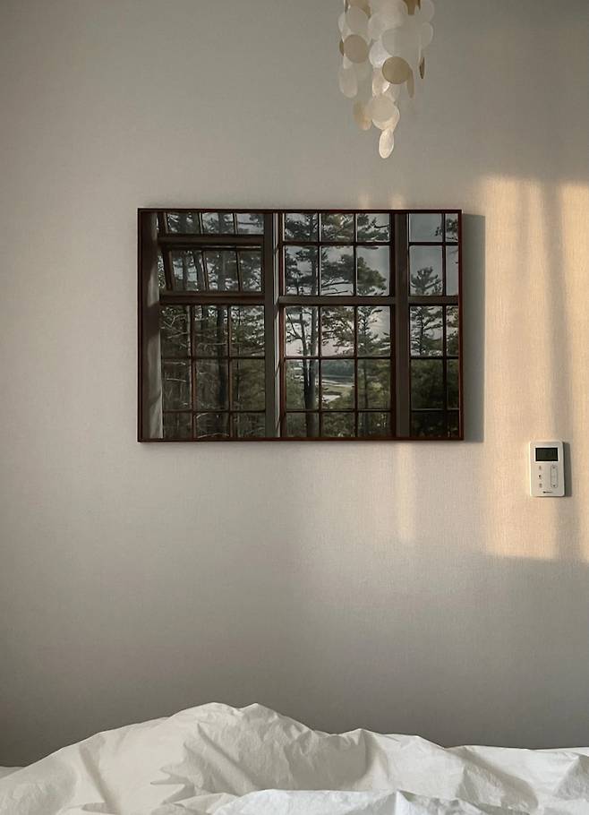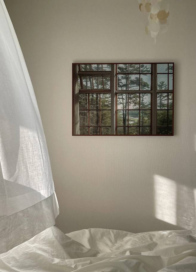 창 밖은 복도여서 창문을 활짝 열 수가 없어요. 그게 아쉬워서 마치 창문 같은 느낌을 주는 액자를 구매해 침대 맞은편에 걸어두었습니다. 침대에 누워 액자를 보고 있으면 가끔은 정말 창문 같은 착각도 들어요:)