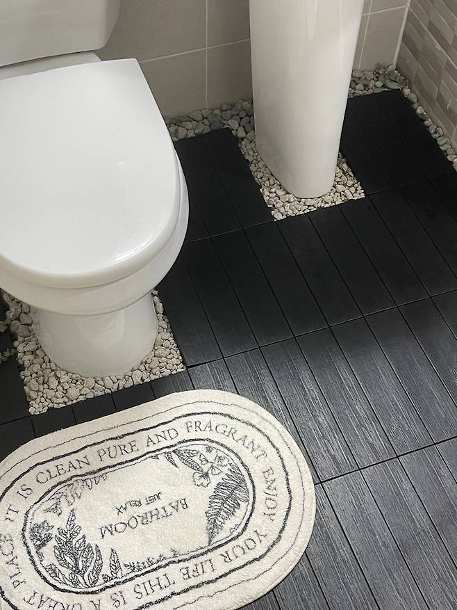 많이들 하시는 것처럼 물막이를 설치하고 데크 타일을 깐 뒤 빈 곳에 자갈을 넣어주었어요. 자갈이 부족해 여기저기서 사다 보니 자갈의 종류가 다 다르지만 그것대로 느낌 있다고 생각하는 중이에요ㅋㅋㅋ! 생각보다 자갈이 많이 필요하니 넉넉하게 구매하세요! 제가 사용한 데크 타일은 잘라서 사용하는 게 아닌 조립식이어서 편하게 설치했답니다!
