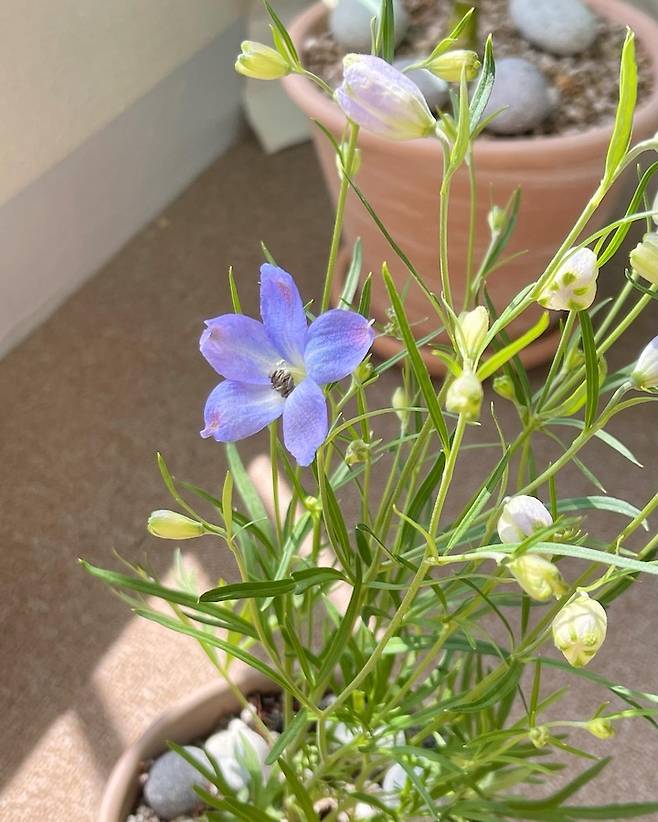 델피늄, 로즈마리, 애플민트, 블루 데이지, 대엽홍콩을 키우고 있어요. 로즈마리는 스테이크를 구울 때 유용하게 활용하고 있답니다.