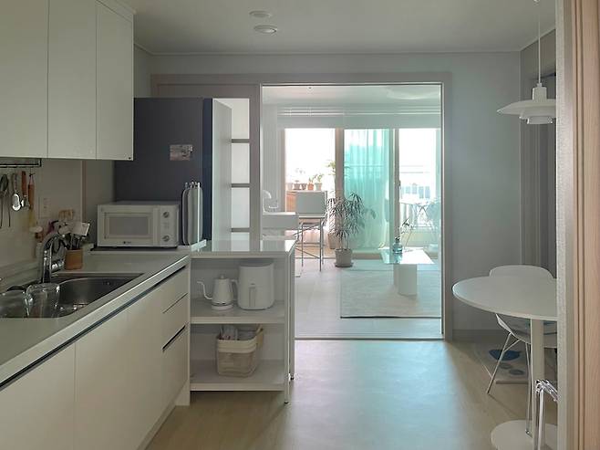 부족한 수납 공간 때문에 반대쪽 벽면에 수납장을 놓자니 식탁을 놓을 공간이 사라지고, 냉장고 공간에 아일랜드 식탁을 두자니 앉을 공간이 없더라고요.