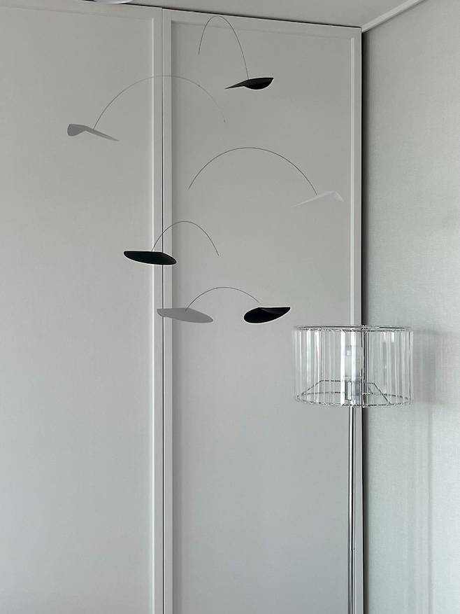 아이보리 색의 소파 옆에는 스마트 전구를 끼운 스탠드를 두었습니다. 스마트 전구는 스마트폰으로 색온도와 밝기를 조절할 수 있는데 편리해서 침실에서도 사용하고 있답니다! 위에 모빌도 살짝 달아주었어요!