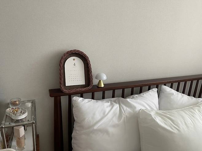 그리고 결국 바라던 퀸 사이즈 침대를 구매했어요! 침대 머리맡에는 선물 받은 램프와 직접 만든 라탄 달력을 두었는데 너무 귀엽지 않나요? ㅎㅎ