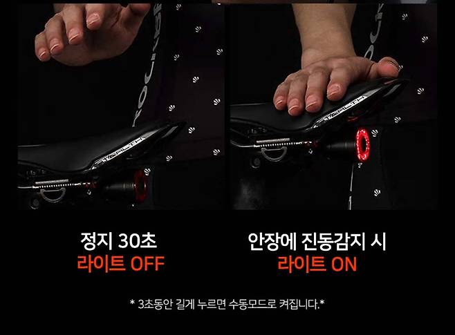 브레이크 감지 안전한 야간 운행 자동 진동 감지기능 정차후 30초 동안 진동이 없을시 자동으로 꺼지고 진동 감지시 자동으로 켜집니다.