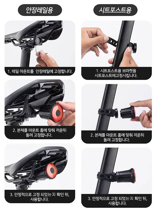 시트포스트? 안장레일? 원하는곳에설치! 시트포스트용과 안장레일용 브라켓이 합꼐 동봉되어 있어 원하는 곳에 설치 할 수 있습니다.