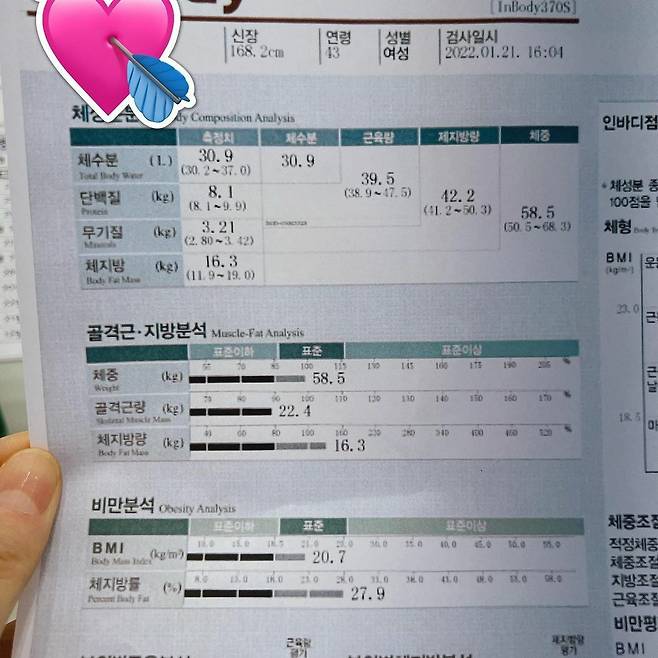 공개된 장영란의 인바디 검사지에는 키 168.2cm, 체중 58.5kg, 체지방률 26.5%라는 결과가 적혀있었습니다. 이어 그녀는 "다시 시작해본다. 53kg 가자. 다가올 봄, 여름을 위하여"라며 다시 한번 운동 의지를 불태워 눈길을 끌었습니다.