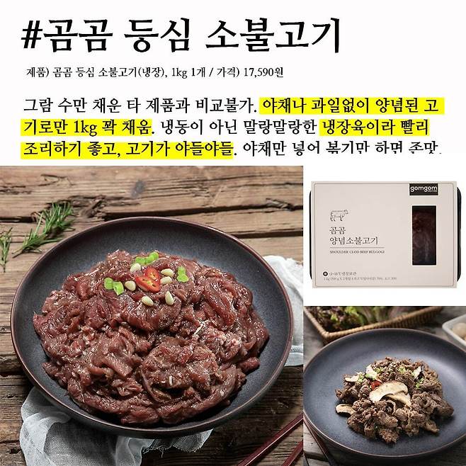 후기만 6만개 넘은 가성비 찐 제품. 살코기가 많고 풍미와 육즙이 풍부한 소 앞다리살과 다진양파, 마늘이 들어간 간장베이스로 적당히 달고 짠 익숙한 소불고기 맛이다. 무엇보다 그람 수 채우려고 무게만 늘린 여느 밀키트와는 절대 비교불가. 다른 야채과일 부속없이 단순 고기와 양념으로만 1kg 꽉 찬 메뉴다. 냉동이 아닌 말랑말랑한 냉장육이라 해동없이 빨리 조리하기 좋고, 적당히 있는 지방에 얇게 저며진 살코기라 야들야들한 맛이 일품. 다른 과정없이 프라이팬에 볶기만 하면 조리 끝. 기호에 맞게 숙주, 버섯, 당면 등을 추가하면 더 맛있게 즐길 수 있다.