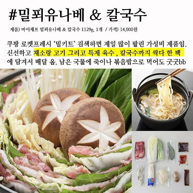 쿠팡 로켓프레시 '밀키트' 부문 판매량 1등에 빛나는 제품. 손질이 따로 필요없는 밀푀유 전골 밀키트다. 신선하고 푸짐한 각종 채소와 고기 그리고 특제 육수 농축액과 칼국수까지 모두 한 팩에 담았다. 일단 내키는대로 넣어 집어 먹는 샤브샤브와 달리, 재료들을 겹겹이 차곡차곡 채워 팔팔 끓여 먹는 밀푀유나베는 비주얼부터 합격. 배추의 시원한 맛과 소앞다리살의 담백한 감칫말이 훌륭하지만 취향에 따라 소스에 콕콕 찍어먹어도 맛있다. 밀키트 한 팩과 냄비, 물만 있으면 언제 어디서든 근사한 일품 요리 완성이다.