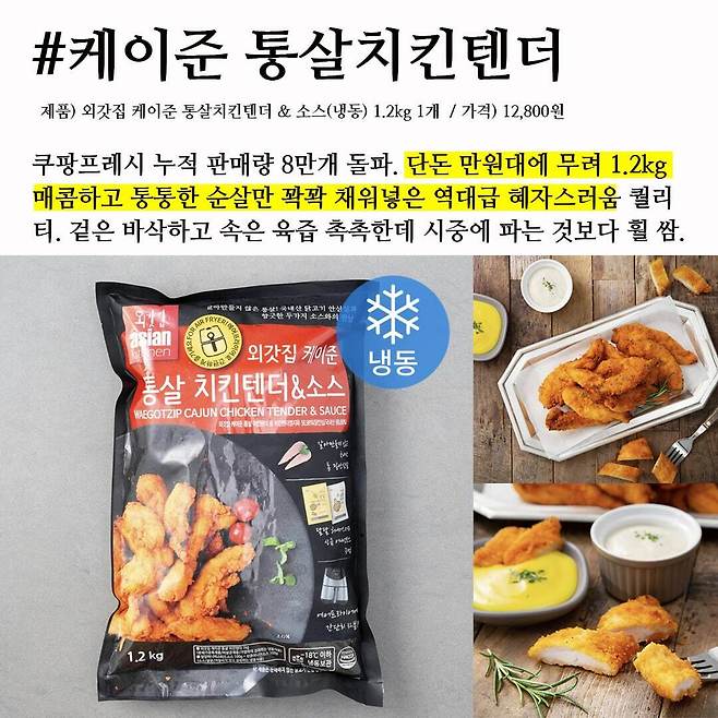 쿠팡프레시 누적 판매량 8만개, 누적 리뷰수 9,894개 돌파. 단돈 만원대에 무려 1.2kg 매콤하고 통통한 순살만 꽉꽉 채워은 치킨텐더다. 국내산 닭 안심 살코기에 케이준 양념 튀김 옷을 얇게 한 번 입혀 냉동한 제품으로, 방금 튀긴 것 같은 바삭함과 촉촉하니 부드럽게 결대로 찢어지는 맛이 일품이다. 양파와 피클을 듬뿍 넣은 상큼한 어니언 소스와 국내산 벌꿀을 첨가해 더욱 달달한 허니 머스타드 소스 두 종류가 함께 동봉되어 온다. 반찬/샐러드/간식/안주까지 한 팩 사두면 시중에 파는 치킨 1마리보다 훨씬 저렴하고 넉넉한 양으로 먹을 수 있는 가성비 냉동치킨.