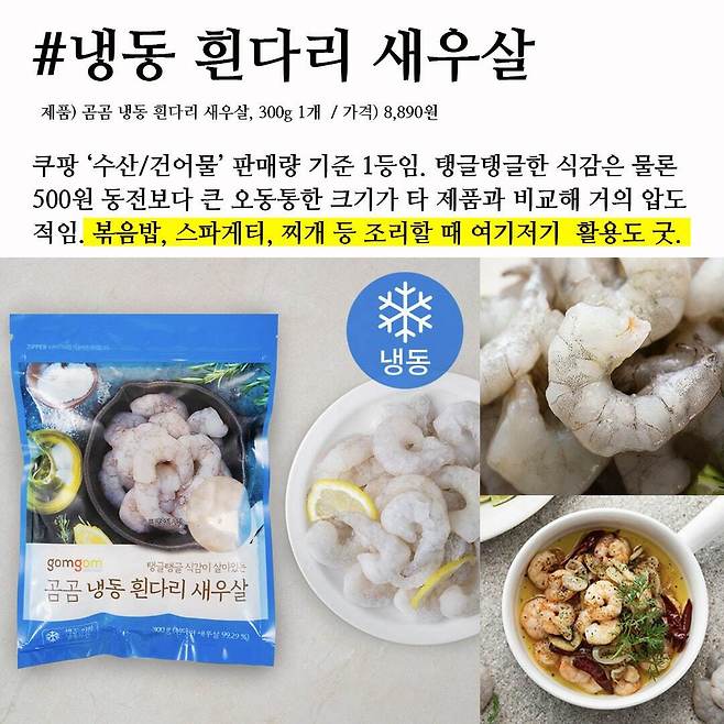 쿠팡 ‘수산/건어물’ 판매량 1등 상품이다. 안 사본 사람은 몰라도 사서 먹어본 사람은 재구매의사 100%라는 냉동새우. 탱글탱글 식감은 물론 거의 500원짜리 동전보다 큰 오동통한 크기가 타 제품과 비교해 거의 압도적이다. 누적 리뷰 2만 4천개에 달하는 인기메뉴답게 이미 손질까지 다 되어 나온다. 찬물에 해동시킨 뒤 한번 헹궈서 바로 요리하면 끝. 볶음밥이나 스파게티, 찌개 등 각종 요리에 넣어 조리할 수 있어 활용도 만점이다. 일반적으로 새우를 끓이거나 볶으면 작아지고 퍽퍽한 맛이 나기 마련인데, 요건 익히거나 구워도 비린내 전혀 없이 모양도 그대로고 부드럽다. 여기에 통통한 새우살이라 한층 더 깊은 풍미와 식감을 더해준다는 게 매력포인트.