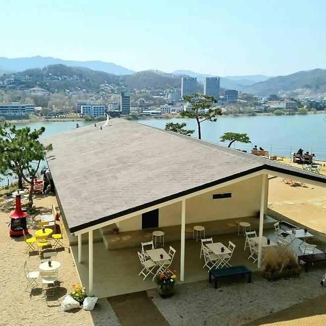 [식신TIP] 남한강의 여유로운 풍경을 한 눈에 내려다볼 수 있는 카페. 카페 앞 너른 잔디밭이 봄의 느낌을 더해주어요. 통창이 있는 실내 좌석도 마련되어 있어요.