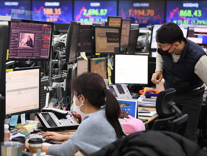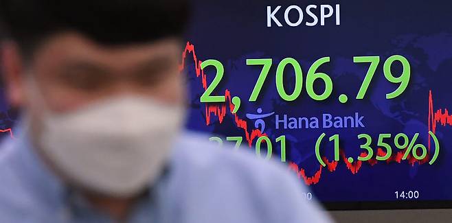 러시아와 우크라이나 간 무력 충돌의 긴장감이 감돌고 있는 가운데 22일 코스피가 1% 넘게 하락하면서 전 거래일보다 37.01포인트 떨어진 2706.79로 마감했다. 이날 서울 명동 KEB하나은행 딜링룸에서 딜러가 러시아 관련 소식을 모니터에 켜 놓은 채 업무를 보고 있다.