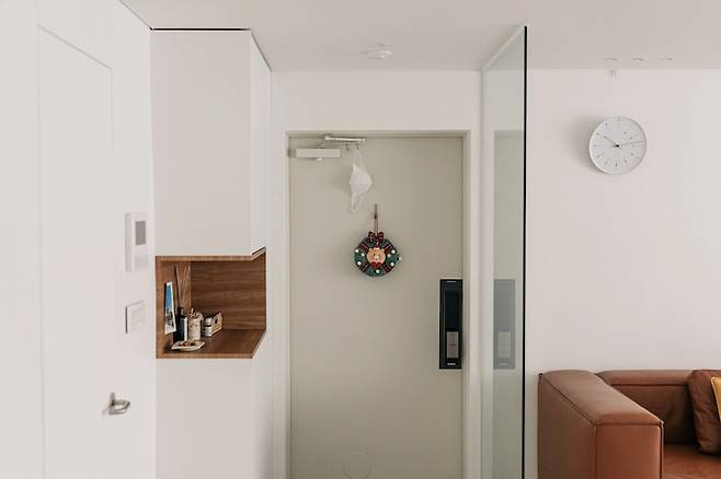 탁 트인 느낌을 주고 싶던 현관입니다. 신발장은 띄움 시공하고 아래 조명을 넣었습니다. 신발장의 중간에는 공간을 두어서 집을 나서면서 챙길 수 있는 물건들을 두고 있어요. 전체 흰색이면 밋밋한 느낌이 들것 같아서 중간 부분에 물건을 놓을 수 있는 공간을 만들었고요. 원래는 신발장 안감과 동일한 색인 영림 필름으로 별도 마감을 했어요.